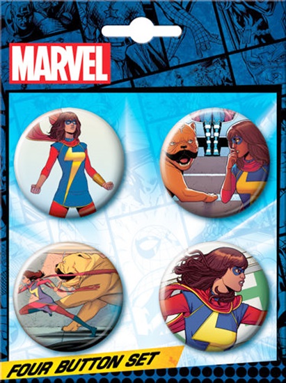 Produced by ATA BOY in 2015, this is set of four 1.25″ wide round buttons that features comic art images of Marvel Comics Ms. Marvel. This is a new, never used, button set attached to a display card stored in a smoke and pet free environment.