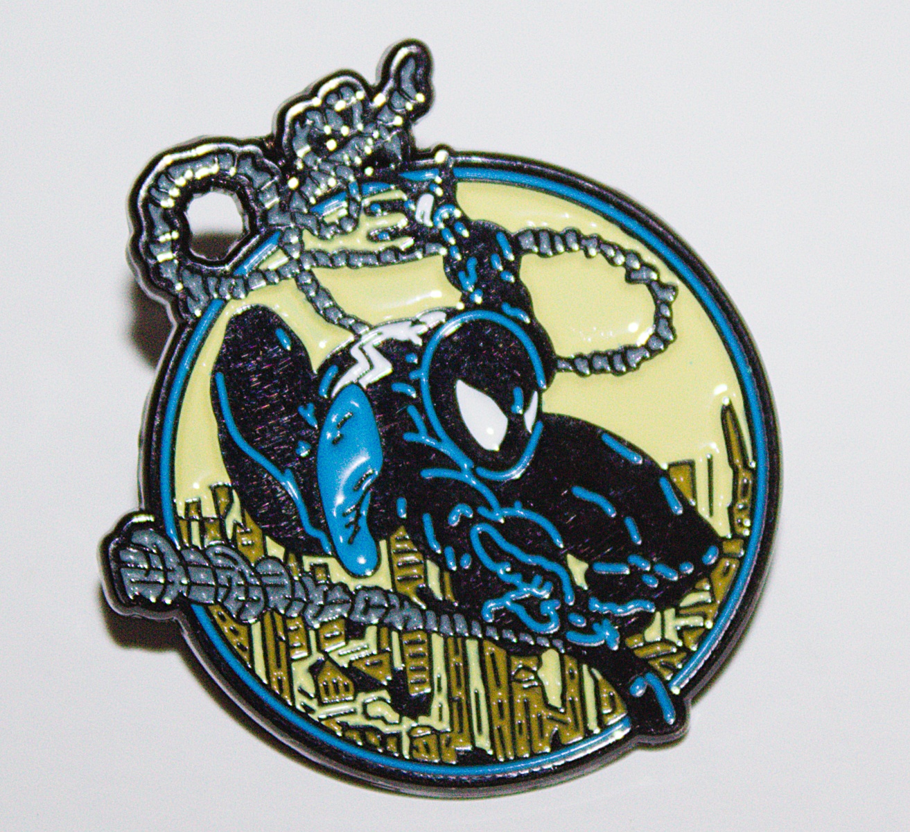 This new, unused 1.25″ wide x 1.375″ high metal enamel pin features the die-cut image of Spider-Man in his black costume (which became Venom) swinging over the city as seen in Marvel Comics. This has not been a widely distributed pin, found usually at sci-fi and comic conventions. It has been stored in a smoke and pet free environment.