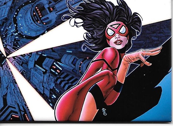 This is a licensed 2.5″ x 3.5″ refrigerator magnet featuring the comic art image of Spider-Woman climbing a building as seen in Marvel Comics. It has been stored in a smoke and pet free environment.