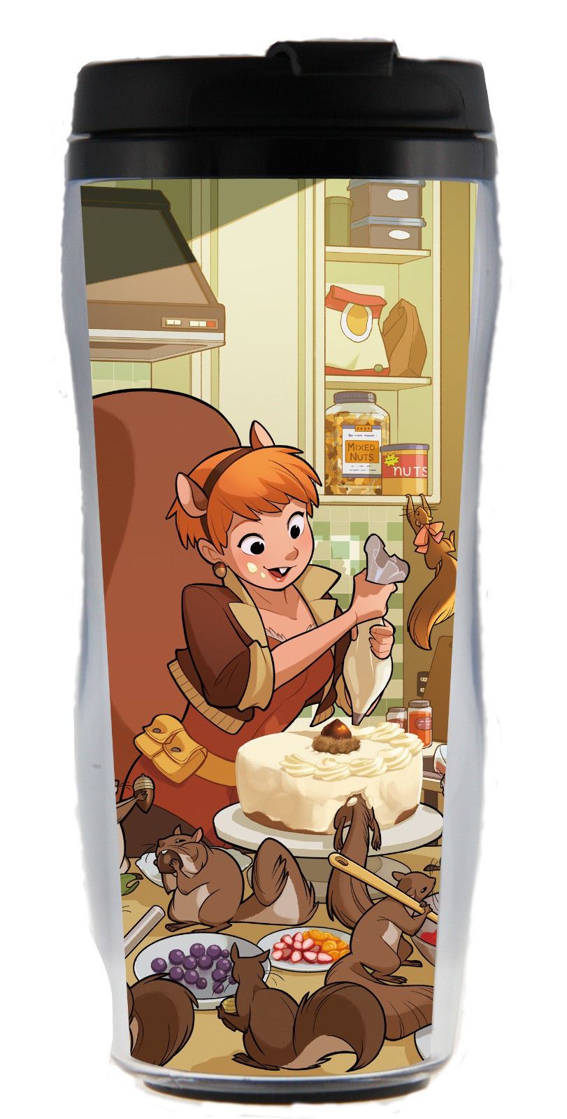 This is an 18 oz plastic travel mug featuring the character of Squirrel Girl from Marvel Comics. This is a new, unused, fully illustrated cup that is slightly shaped. This travel mug is lightweight with a secure snap on lid. It is not microwave safe. Please hand wash only. It is stored in a smoke and pet free environment.