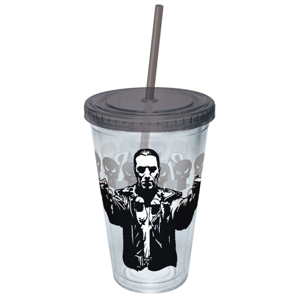 Produced in 2014 this is a 16 ounce acrylic travel cup that features the comic art image of The Punisher with guns drawn from the popular Marvel Comic book series. This is a new, unused acrylic travel cup, is BPA free and comes with a lid and straw. It is stored in a smoke and pet free environment.