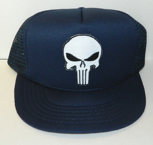This is a BLACK cloth adjustable baseball style (meaning a round bill) hat (made of 65% polyester and 35% cotton) with a 100% polyester mesh back and a mint, embroidered patch on the front featuring the familiar skull logo of the Punisher. Produced for the comic book marketplace after the release of the recent Punisher movie, this is a difficult patch to find outside of comic book conventions and stores. This is a new, never worn hat stored in a smoke and pet free environment.