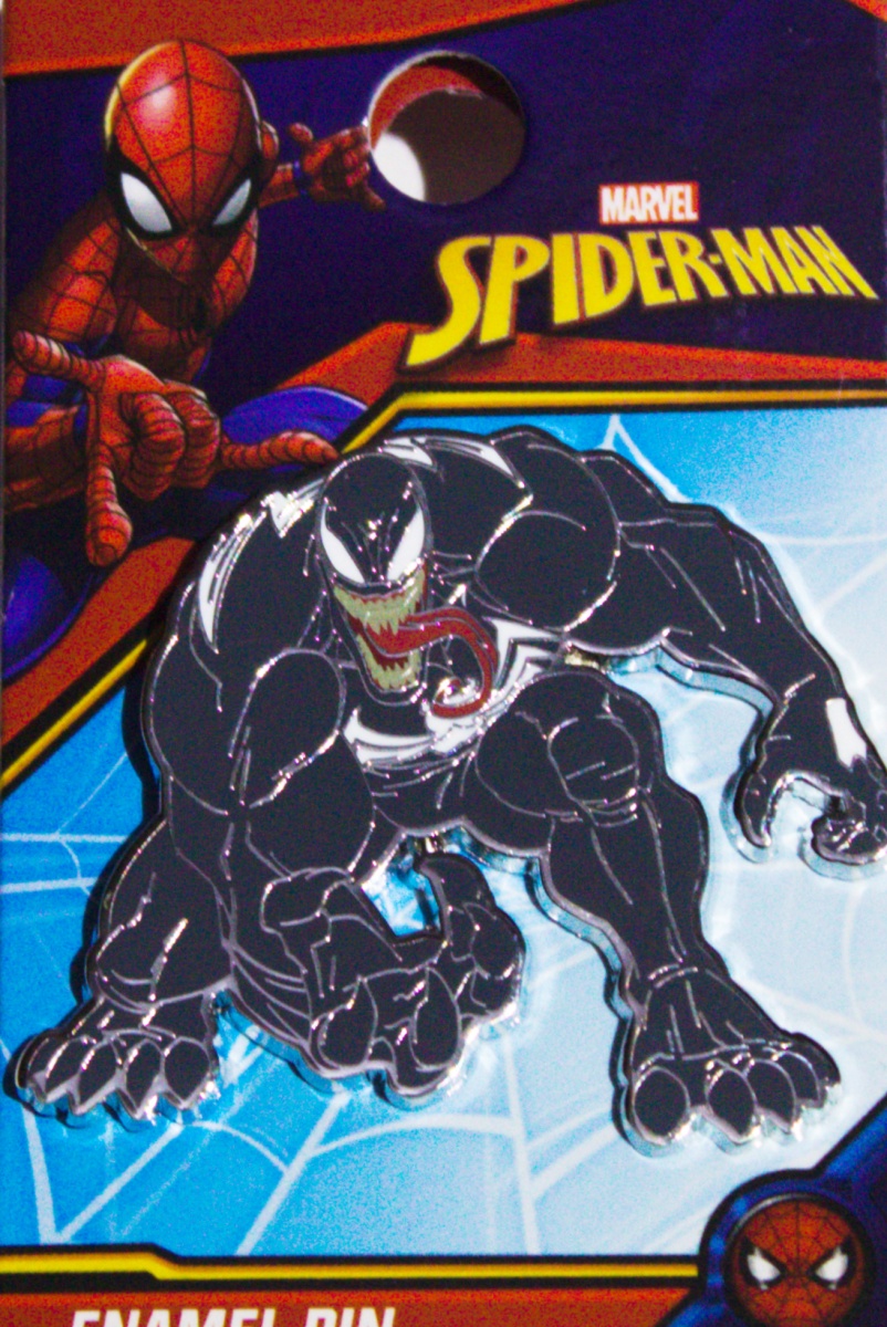 This new, unused 1.875″ wide x 1.5″ high metal enamel pin features the die-cut crouching image of Venom as seen in Marvel Comics Spider-Man comics and the Venom movies. This has not been a widely distributed pin, found usually at sci-fi and comic conventions. It has been stored in a smoke and pet free environment.