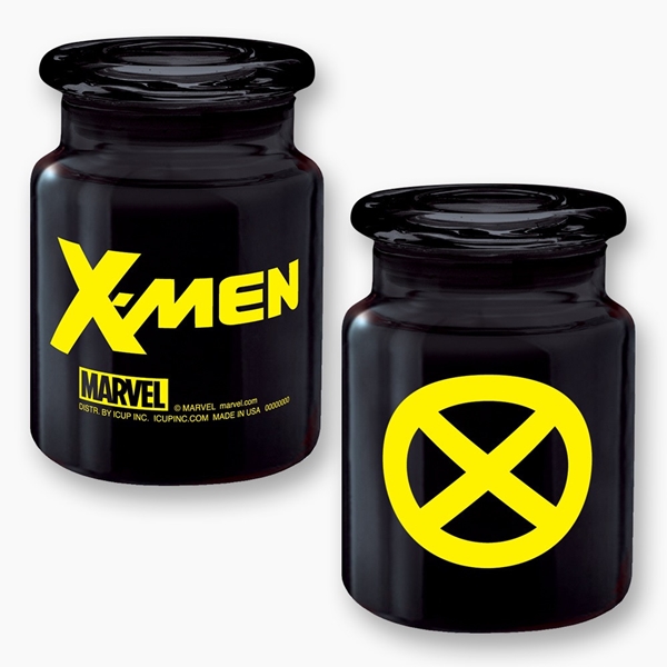 This is a black apothecary style 6 oz jar featuring the comic art image of the X logo of Marvel Comics X-Men on the front and their name logo on the back. It measures 3.75″ high and comes with an airtight lid, perfect for storing those small items you want to keep fresh. It is new, unused and stored in a smoke and pet free environment.