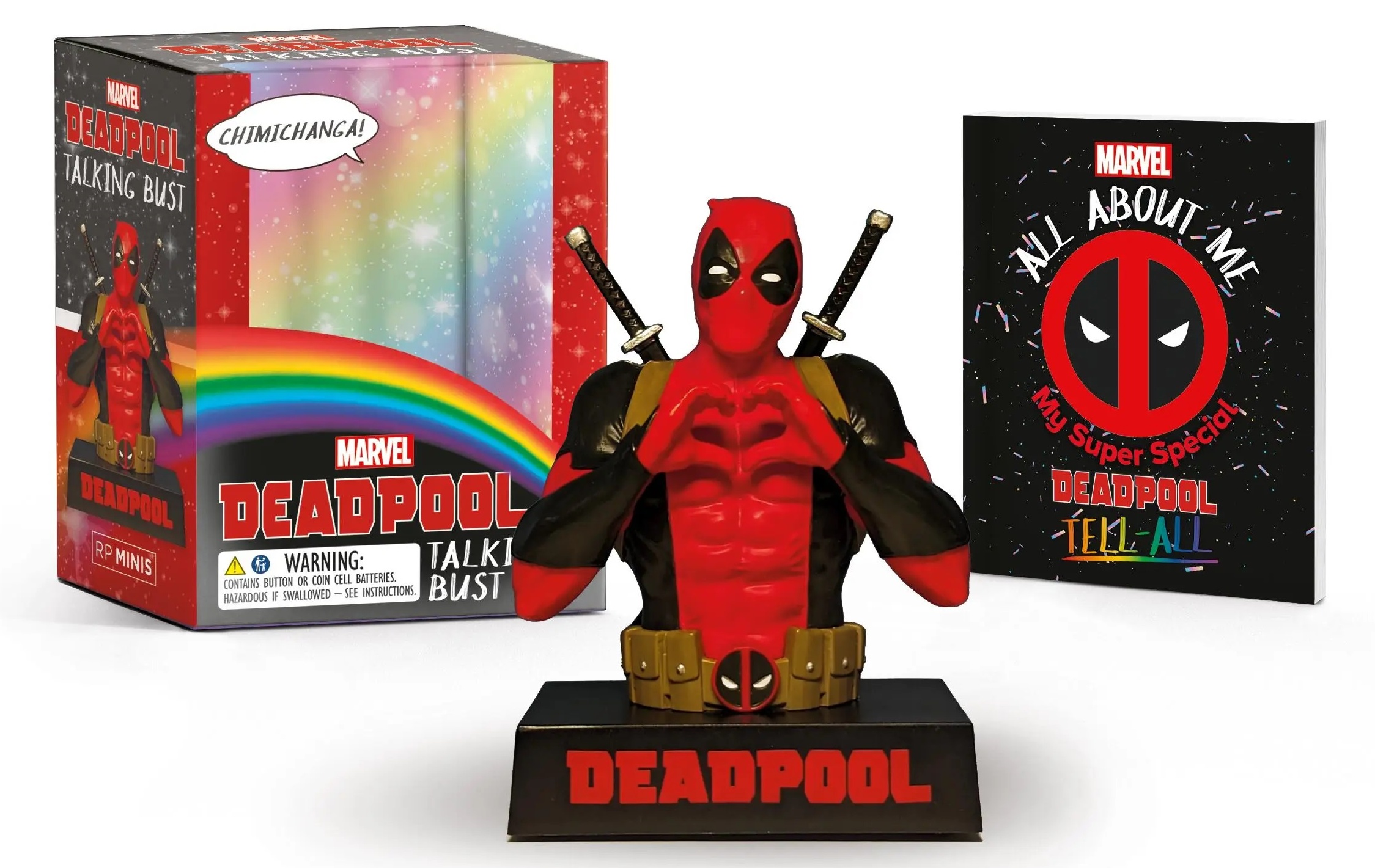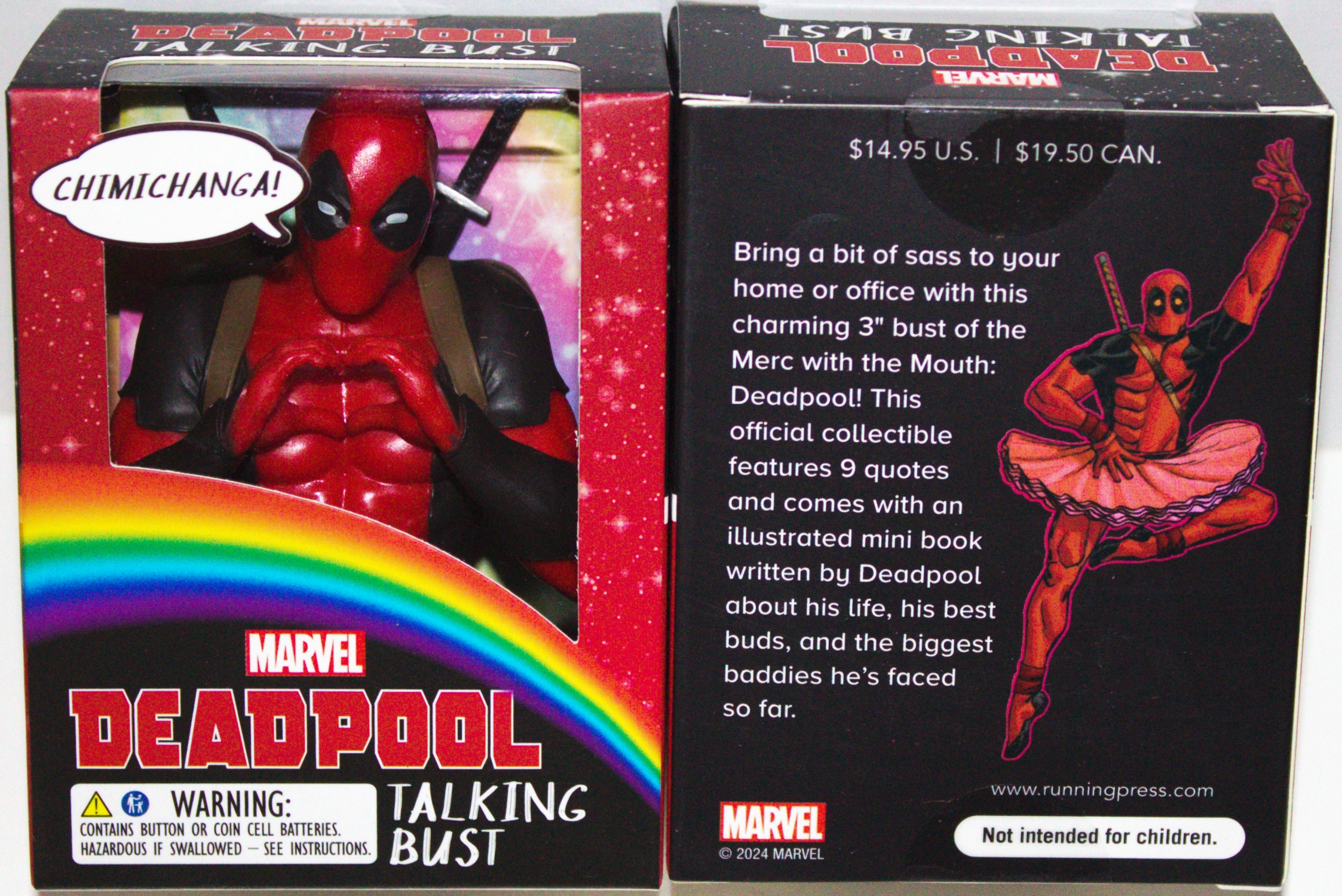 Chimichanga! It’s time to party with this one-of-a-kind, officially licensed, talking collectible of Marvel’s Merc with a Mouth! Unique figurine with sound: This 3-inch bust of Deadpool says, “It’s DEADPOOL!” and eight other iconic phrases at the touch of a button. It includes a 48-page mini book “written” by Deadpool about his origin, best buds, and bad guys he has taken on, complemented by full color, classic comic book art. Marvel fans will enjoy displaying this sassy deluxe bust of a fan favorite character This is a new, sealed copy that we purchased direct from the publisher and it has been stored in a smoke and pet free environment.