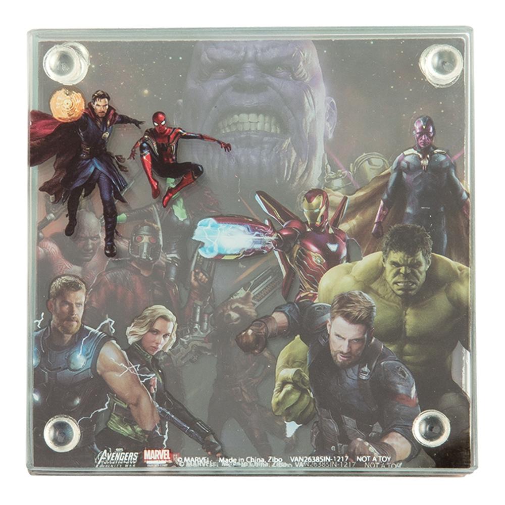 This is 4″ x 4″ set of four glass coasters featuring photo images from the hit Marvel Comics movie Avengers: Infinity War. When stacked over each other they form a new combined Infinty War image. It is a new, unused set with non-slip rubber feet to prevent scratching comes in a full color window box. It has been stored in a smoke and pet free environment.