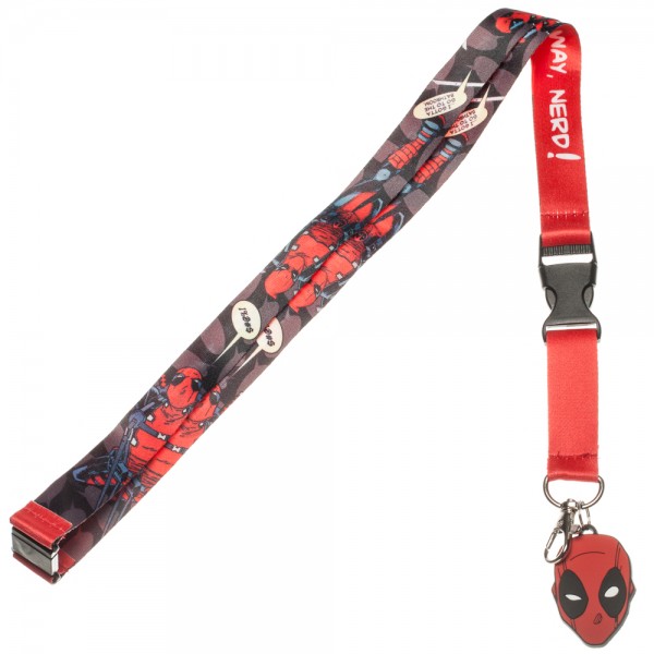 Produced in 2016 is this 18″ long metal, cloth and plastic red and black lanyard that is covered with comic art images of Marvel Comics Superhero Deadpool on one side and the phrase “Get outta de way NERD!” on the other. There is also a PVC 3D Deadpool head logo charm attached at the bottom along with a 3.75″ x 4.25″ open plastic badge holder with a peel off sticker of his head. It can be used to hold keys, name tags, membership and business cards and more. This is a mint, unused lanyard stored in a smoke and pet free environment.