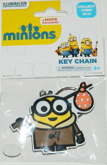 This is a licensed, 2.5″ x 2″ rubber keychain featuring the art image of Bob the minion as a hobo from the new hit movie Minions, the sequel to the Despicable Me movies.