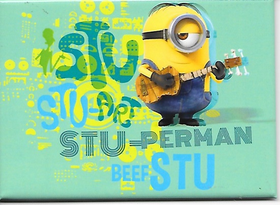 This is a licensed, large 2 1/2″ x 3 1/2″ refrigerator magnet featuring the art image of Minion Stuart beside the words “Stu Stuart STU-PERMAN Beef STU ” from the new hit Minions movie based on the Despicable Me movies. This is stored in a smoke and pet free environment.