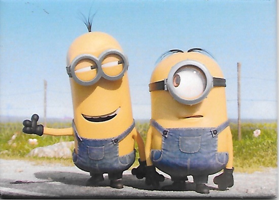 This is a licensed, large 2 1/2″ x 3 1/2″ refrigerator magnet featuring the art image of Minions Stuart and Kevin hitchhiking from the new hit Minions movie based on the Despicable Me movies. This is stored in a smoke and pet free environment.