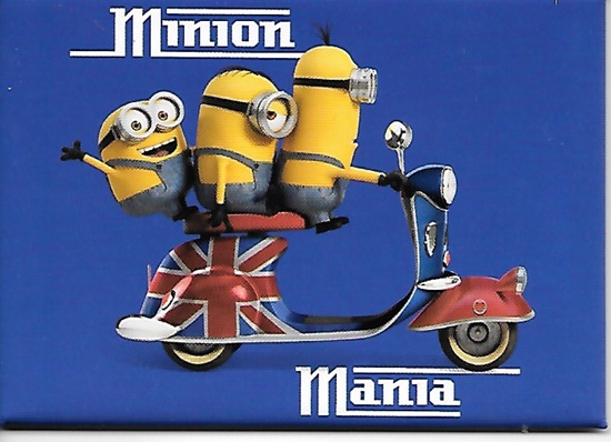 This is a licensed, large 2 1/2″ x 3 1/2″ refrigerator magnet featuring the art image of Minions Stuart Kevin and Bob riding on a scooter with the British flag on it and surrounded by the words Minion Mania from the new hit Minions movie based on the Despicable Me movies. This is stored in a smoke and pet free environment.