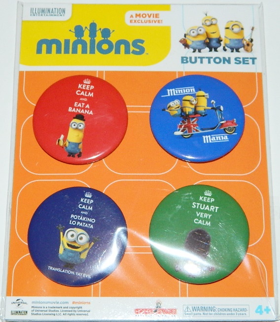 This is a licensed set of four 1.75″ wide metal buttons featuring different images from the new Minions movie, based on the hit Despicable Me movies. This is one of a set of 4 different and each features various images of Bob, Stuart and Kevin. They are new and unused, sealed on a display card, and stored in a smoke and pet free environment.