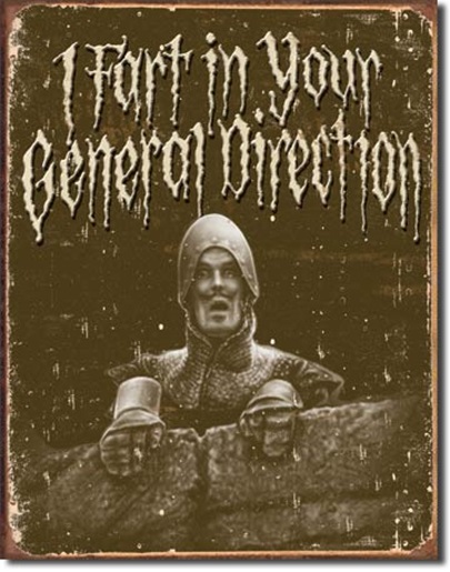 This is a 12.5″ x 16″ heavy grade tin sign that reproduces a classic scene from the cult movie Monty Python and the Holy Grail, featuring a Frenchman hollering the insult “I Fart in Your General Direction”. These are produced in the style of the original tin signs that were common in the first half of the 20th century. It is a mint, never used sign, complete with pin holes in the corners for easy hanging, stored in a smoke and pet free environment. These also look very nice framed. Because they are painted tin signs sometimes there might be very light scratching nears the corners.