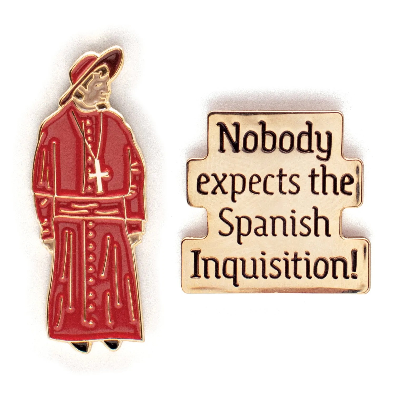 This is a set of two metal enamel pins that feature images from the cult TV series Monty Python’s Flying Circus Spanish Inquisition skit. Nobody expects The Spanish Inquisition! Our chief weapon is surprise – surprise and fear, fear and surprise… I’ll come in again. The priest is 1.5″ high and the phrase pin is 1″ tall. New and unused they are stored in a smoke and pet free environment.