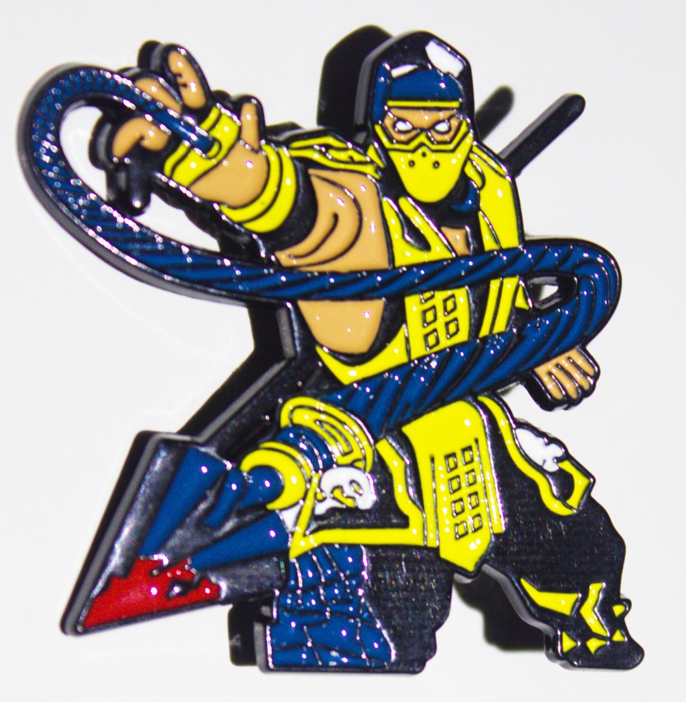 This is a 1.5″ wide x 1.5″ tall multi-colored enamel metal pin that reproduces the image of Scorpion with his spear from the popular Mortal Kombat game Series. New and unused it is stored in a smoke and pet free environment.
