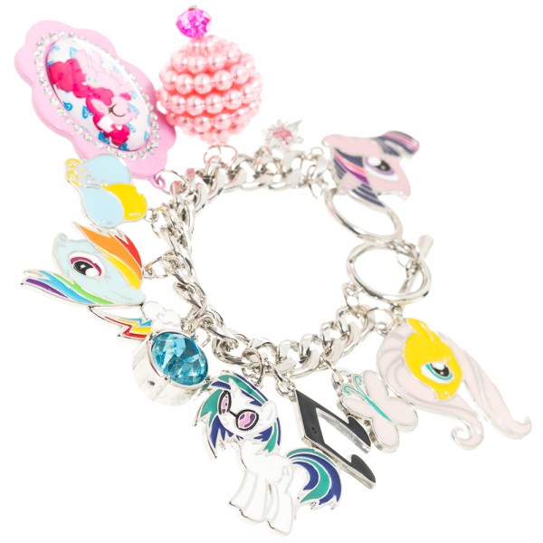 Produced by Bioworld in 2015 this is a licensed silver toned metal charm bracelet with 12 different metal charms featuring the logos and images of many of some of the more popular characters from the My Little Pony animation series. These are colorful and sometimes large die-cut logos and figures ranging from 5/8″ to 1 3/4″ wide or tall. It is a new and unused bracelet still sealed in its original packaging and stored in a smoke and pet free environment.