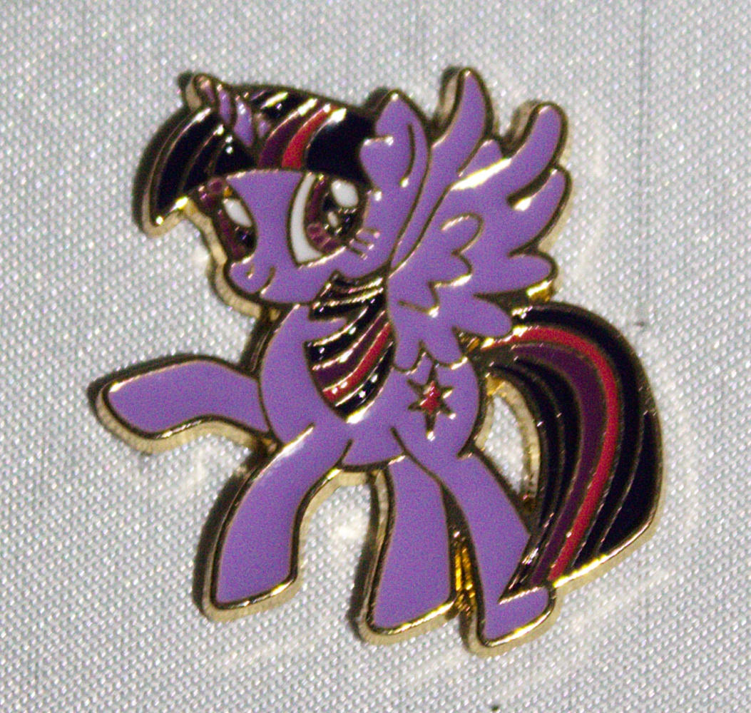 This new, unused 1″ wide x 1.125″ high enamel metal pin features the image of Twilight Sparkle as seen on the popular animated TV series My Little Pony. It is attached with a clutch back pin and has been stored in a smoke and pet free environment.