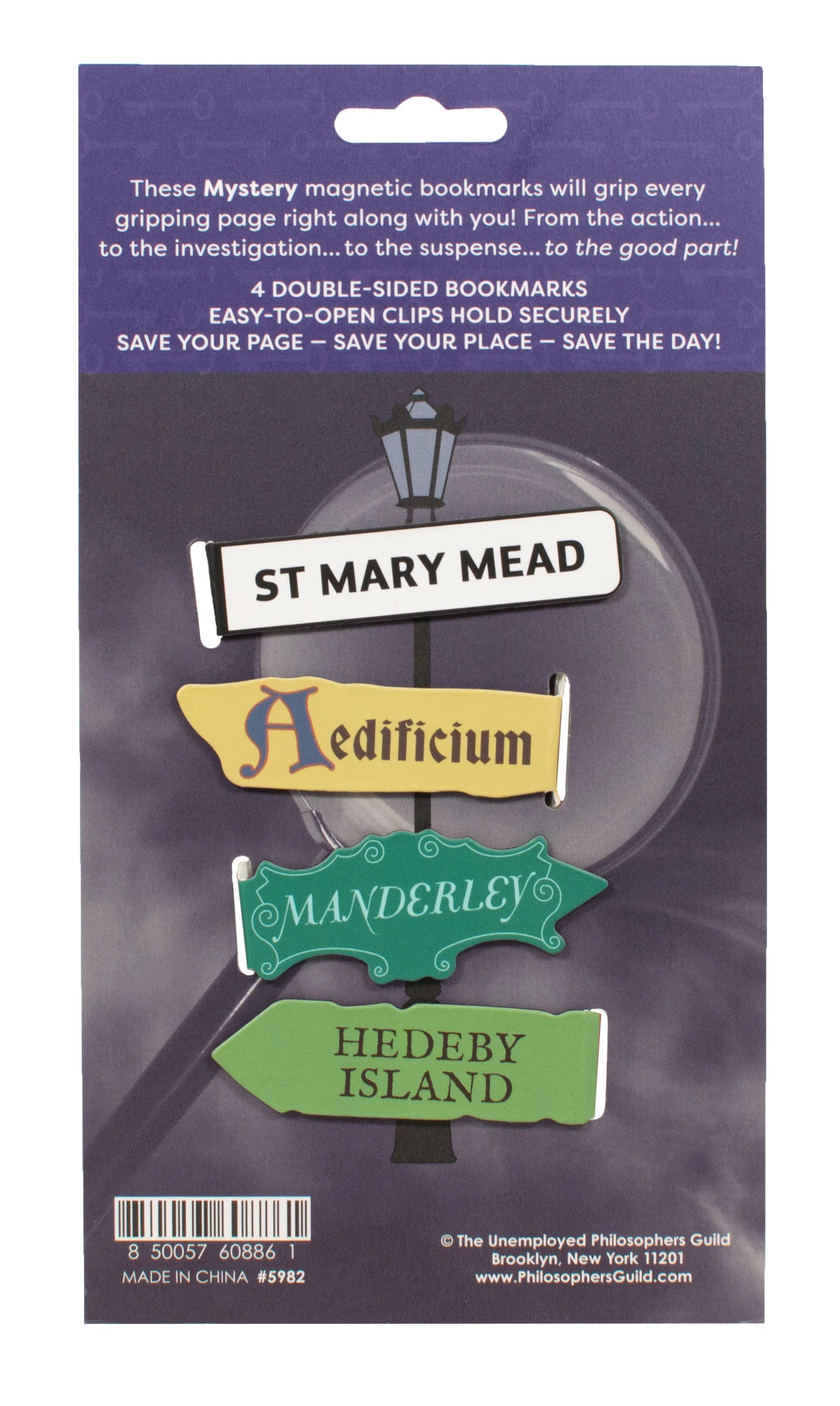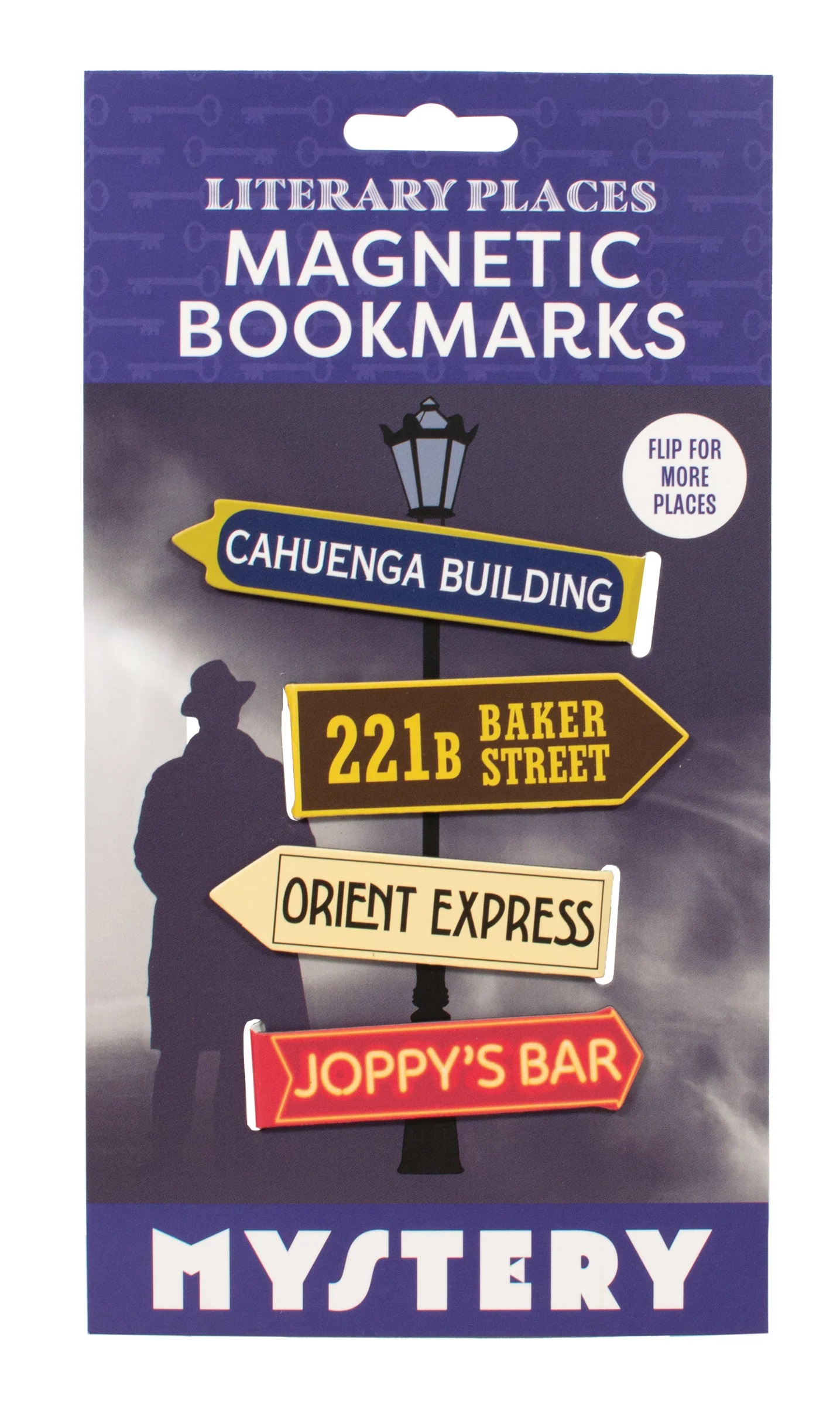 Who doesn’t love a good whodunit? Mark your place at 221B Baker Street, the Orient Express, Manderley, St. Mary Mead, – in all, eight iconic locations and destinations… and all from classic mysteries. Did you hear that “click” just now? Either it’s the lock on the door downstairs… or the cylinder of a .38… or one of the Mystery Magnetic Bookmarks closing on a page… Now you’ll never get lost – not even when you’re lost in a good book. These Literary Places Magnetic Bookmarks hold your place until you can hold off everything else. Powered by lo-tech, easy-to-operate, hinge technology more than 3,625 years old, each Bookmark features two signs held together by a bendy bit – so there’s an eye-catching image on either side of the page! This is a new, unused magnet set sealed in its original package and stored in a smoke and pet free environment.