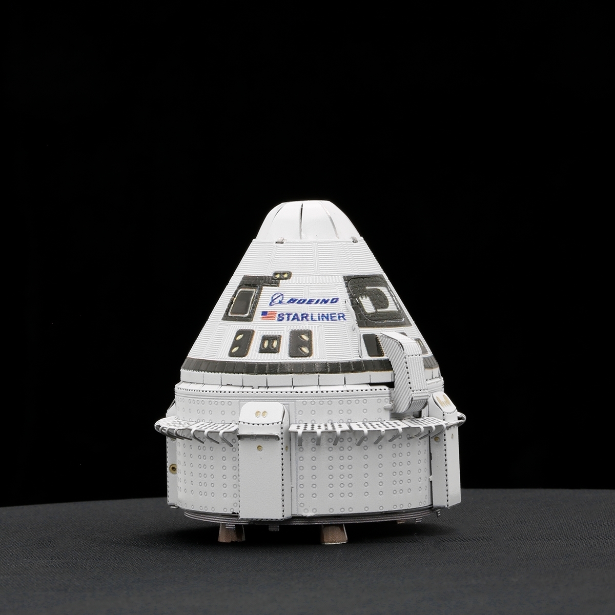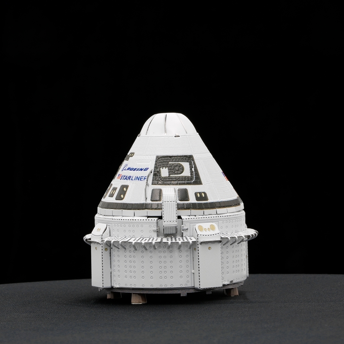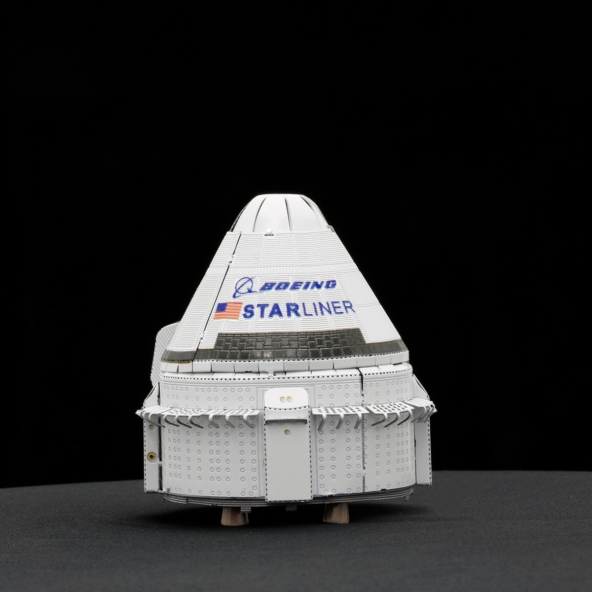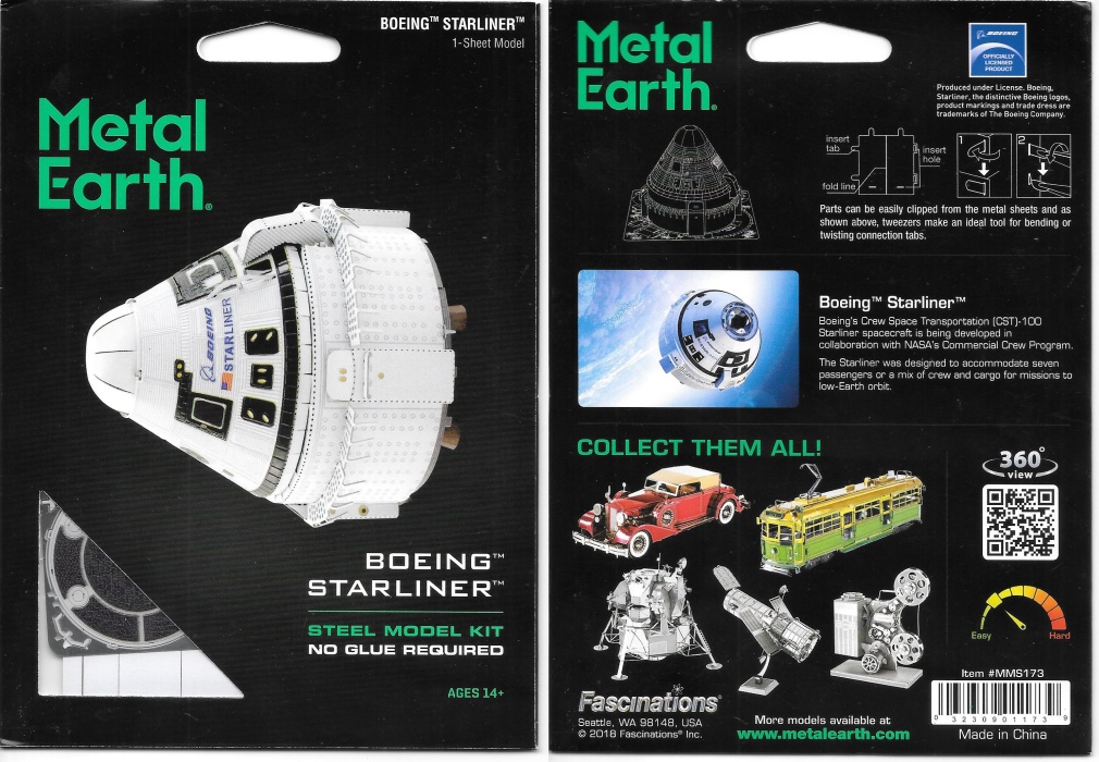 This amazingly detailed model starts as a 4″ square sheet and finishes as a 3-D model. Boeing’s Crew Space Transportation (CST)-100 Starliner spacecraft is being developed in collaboration with NASA’s Commercial Crew Program. The Starliner was designed to accommodate seven passengers or a mix of crew and cargo for missions to low-Earth orbit. The sheet contains detailed laser etching for easy removal and when completed measures 1.97″ diameter x 2.17″ high with easy difficulty. Complete instructions are included to show you how to pop out the pieces, bend the tabs, and connect them at the attachment points with an average assembly time of 30 minutes. It has been stored in a smoke and pet free environment. We also offer an optional LED base (white or blue lights) or a Solar Powered Spinner for better display of your model.