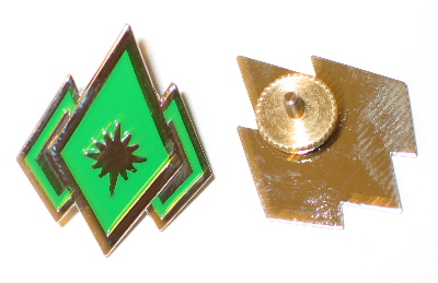 These are a screen accurate deluxe reproduction pair of highly detailed Crew Master Chief Petty Officer collar rank pips, as seen on the hit sci-fi TV series Battlestar Galactica. These are made of a heavy cast copper and nickel metal alloy in a green and silver tone finish, measuring 1.125″ high. The edge of the pin and interior bars are silver tone and the interior in a shiny green tone. They are not the thin cheaply made pins offered by some other sellers or overpriced as some are doing for the same pins. It has been stored in a smoke and pet free environment.
