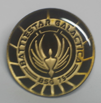 This is an enamel metal pin reproduction of the patch worn on the shoulder of the crew of the Galactica on the recent hit TV series Battlestar Galactica. This is a new, mint, unused pin, measuring 1 3/16″ across and stored in a smoke and pet free environment.