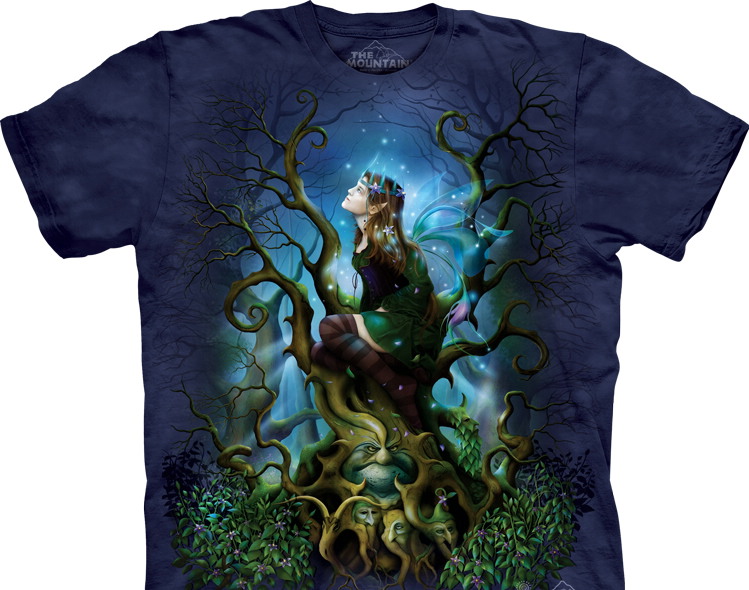 This is navy blue, hand-dyed, pre-washed, pre-shrunk 100% cotton fantasy t-shirt printed with Earth friendly dyes from The Mountain t-shirt company.