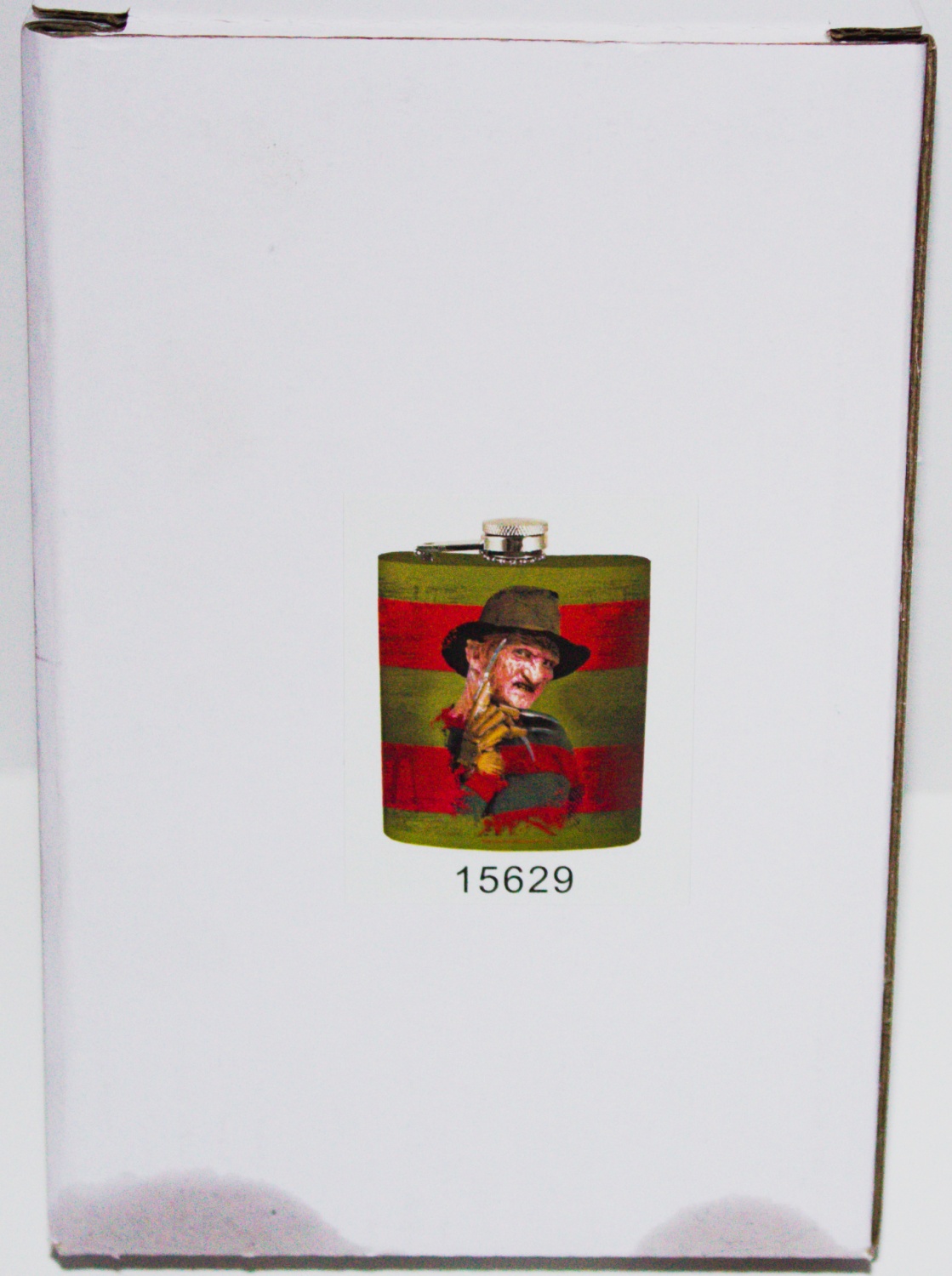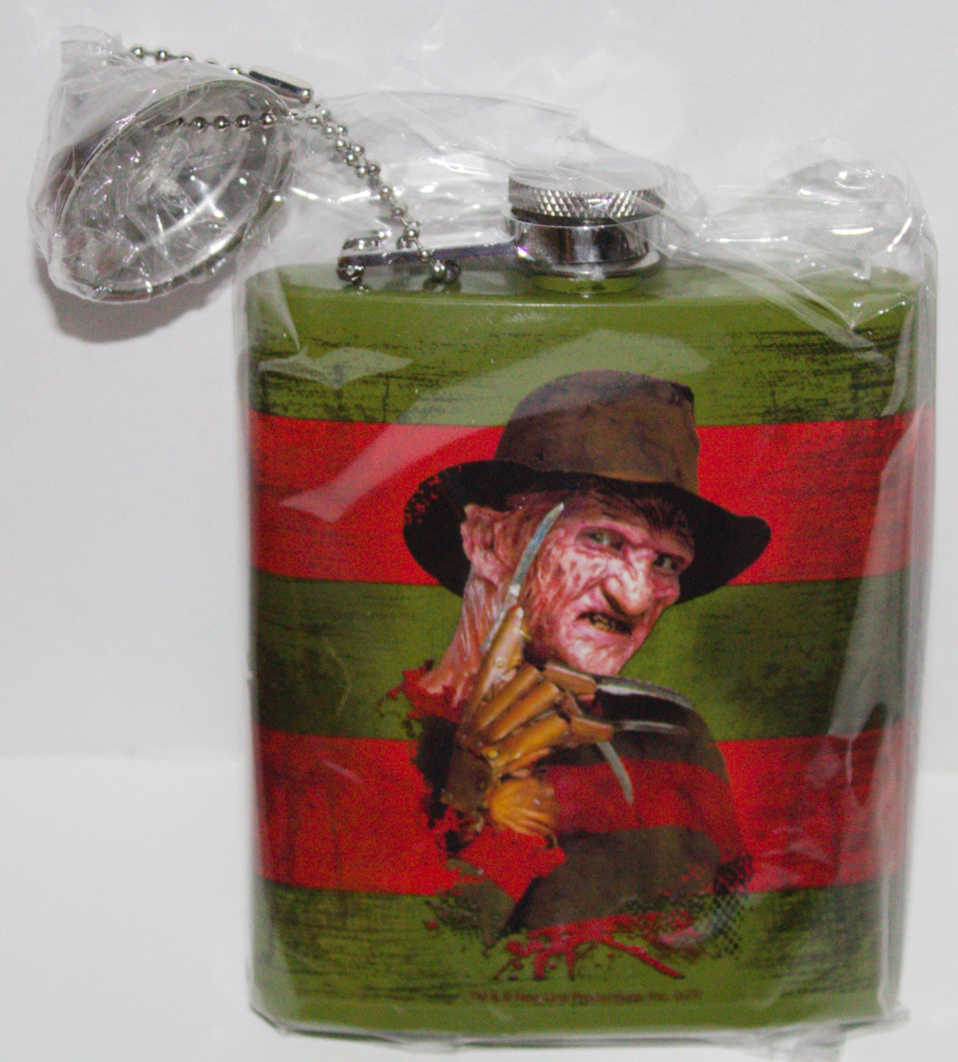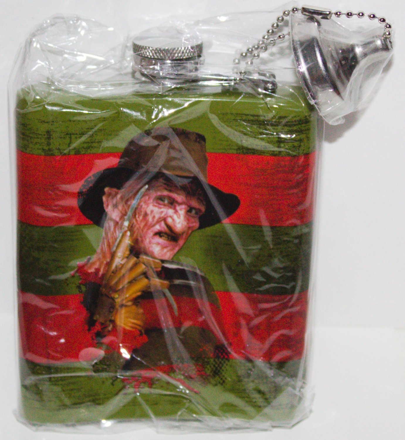 This is a 7 oz stainless steel flask featuring the image of Freddy Krueger over his sweater colors from the horror movies. Nightmare On Elm Street. It measures 4.5″ high x 4″ wide and is a new and unused flask. It comes in a protective box and is stored in a smoke and pet free environment.