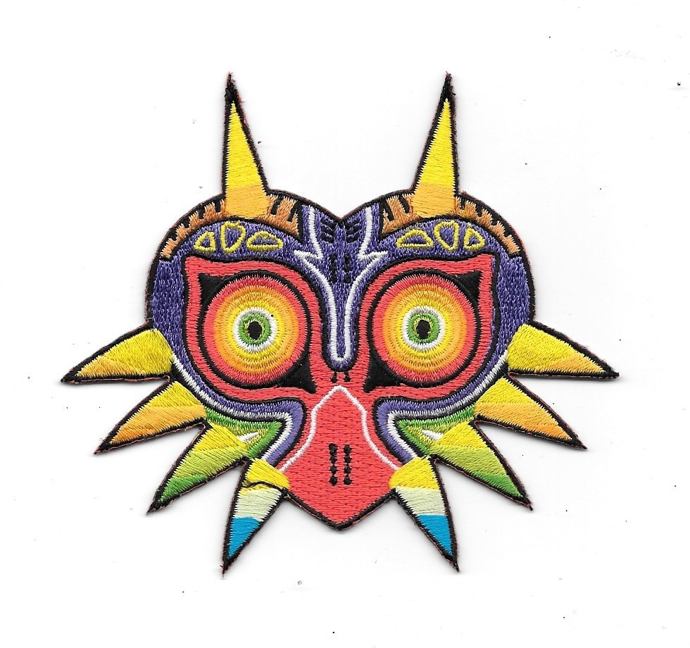 This is a 3.75″ x 4″ high new and unused embroidered die-cut patch that reproduces the colorful mask from the popular Nintendo electronic game The Legend of Zelda Majora’s Mask. It has a glue backing for easy application to a cloth surface and is stored in a smoke and pet free environment.