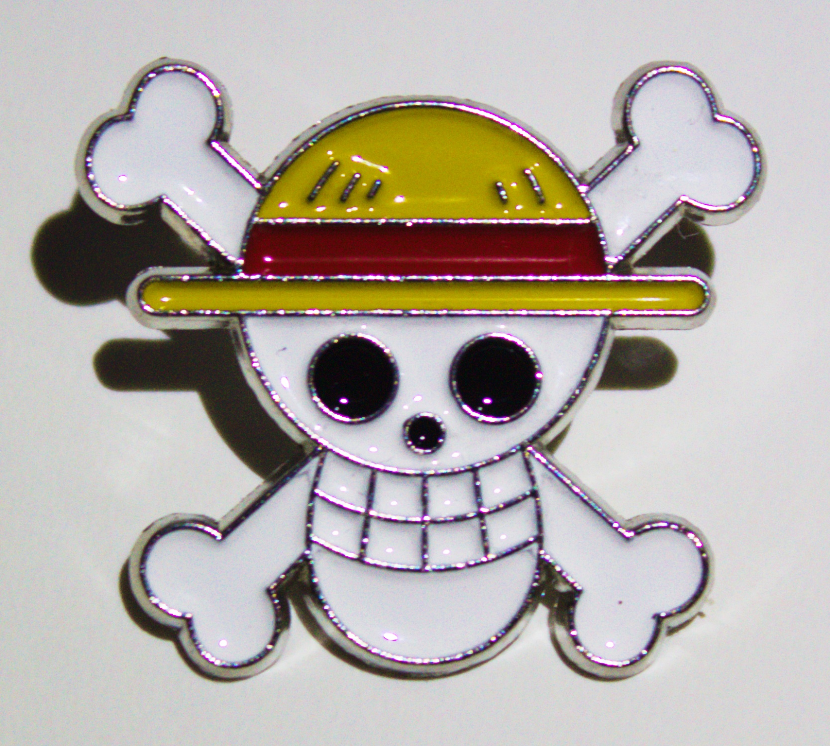 This is a 1″ tall x 1.125 wide metal enamel pin featuring the Straw Hat pirate flag skull logo from the popular Japanese anime series One Piece. It is in nw, unused condition stored in a smoke and pet free environment.