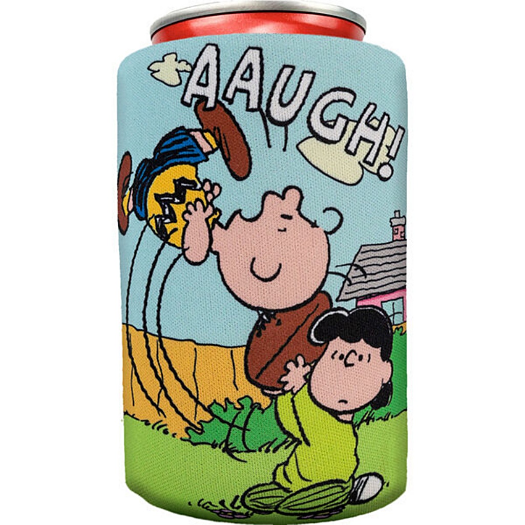 This is an illustrated can cooler featuring the classic image of Charlie Brown trying to kick the football and Lucy pulling it away at the last minute from the popular Peanuts comic strip. Spot Clean recommended. It is a new and unused can cooler huggie koozie stored in a smoke and pet free environment.