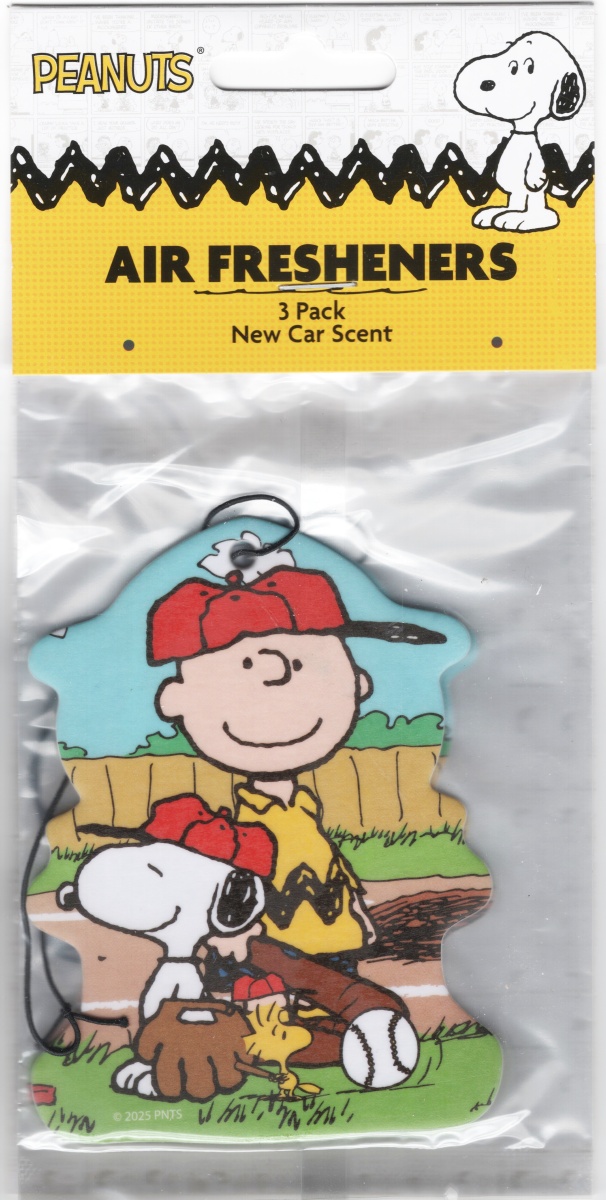 This is a set of three (3) illustrated new car scent air fresheners featuring an image of Charlie Brown standing beside Snooppy and Woodstock getting ready to play baseball from the popular Peanuts cartoon strip. Measuring 4″ x 3″ these are new and unused sealed air fresheners stored in a smoke and pet free environment.
