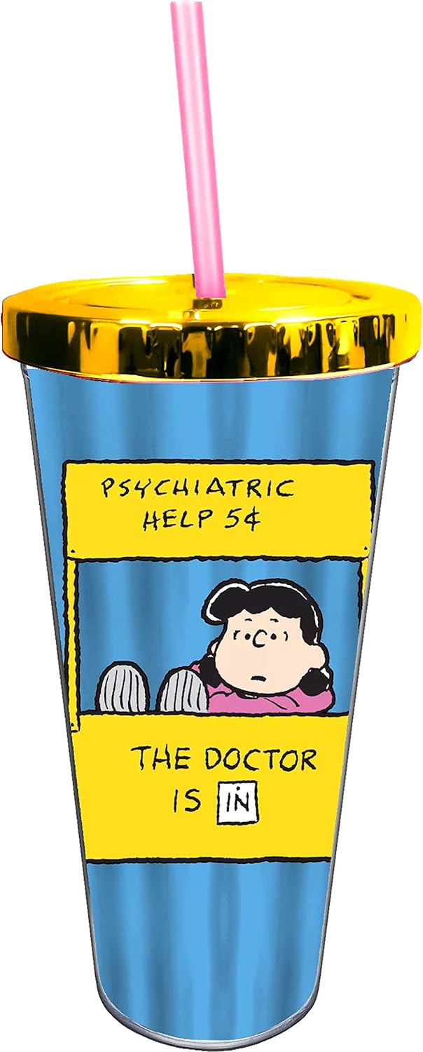 This is a blue and yellow 16 ounce foil travel cup with a gold lid and a straw featuring the image of Lucy behind her psychiatric booth as seen in the Peanuts comic strip and TV movies. It comes in a protective box and is a new, unused cup stored in a smoke and pet free environment.