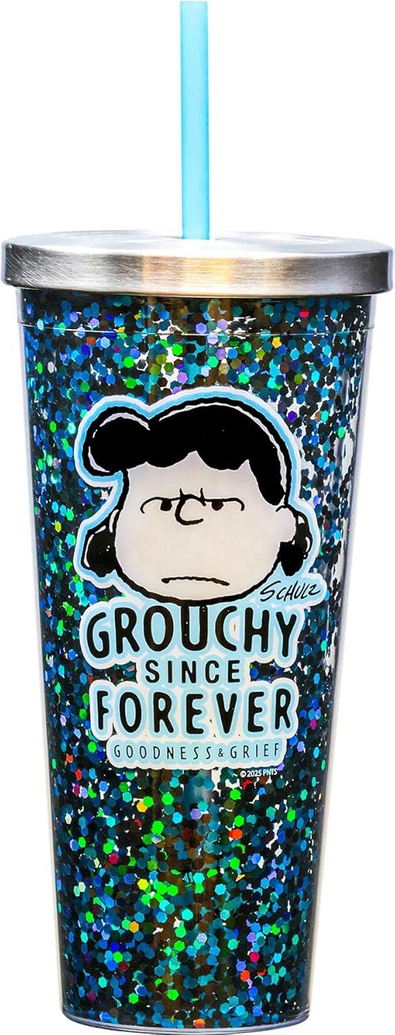 This is a 20 ounce glitter travel cup with a straw and stainless steel locking lid It features Lucy above the phrase “Grouchy Since Forever, Goodness and Grief” from the popular Peanuts comic strip and TV specials. It comes in a protective box and is a new, unused cup stored in a smoke and pet free environment.