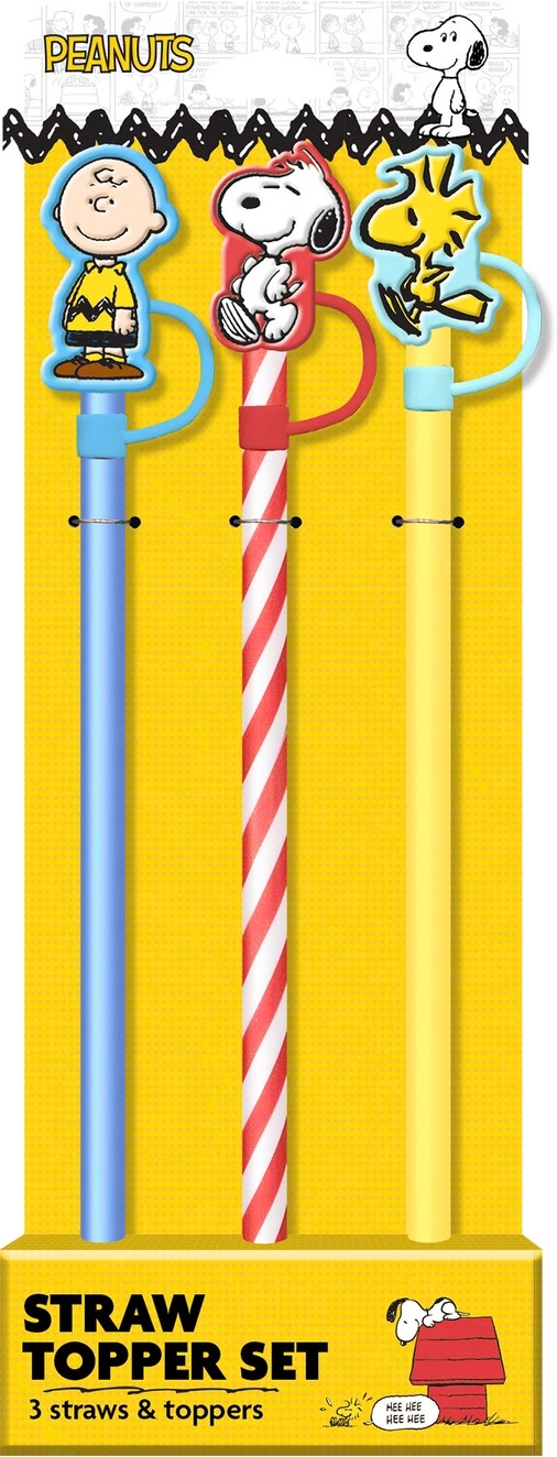 This is a set of three reusable 12.5″ long silicone straws each with a different rubber Peanuts character images removable topper. It is designed so so when you remove the topper from the straw it is still attached. The straws can be cut to the length you desire and come in an illustrated open protective box. They are new, unused and stored in a smoke and pet free environment.