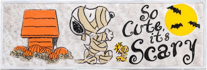 This is a new and unused heavy resin desk sign measuring 8″ x 2.75″ x .375″ with the images of Snoopy and Woodstock desguised as Mummies for Halloween from the popular Peanuts comic strip and TV specials. To their right are the words “So Cute It’s Scary”. It has two padded legs to stand it up on your desk or shelf. New and unused it is stored in a smoke and pet free environment.