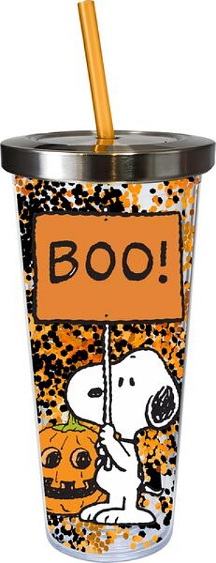 This is a 16 ounce glitter travel cup with a straw featuring the image of Snoopy holding a sign with BOO! on it, standing beside a Jack-o’-Lantern from the popular Peanuts comic strip and TV specials. It comes in a protective box and is a new, unused cup stored in a smoke and pet free environment.