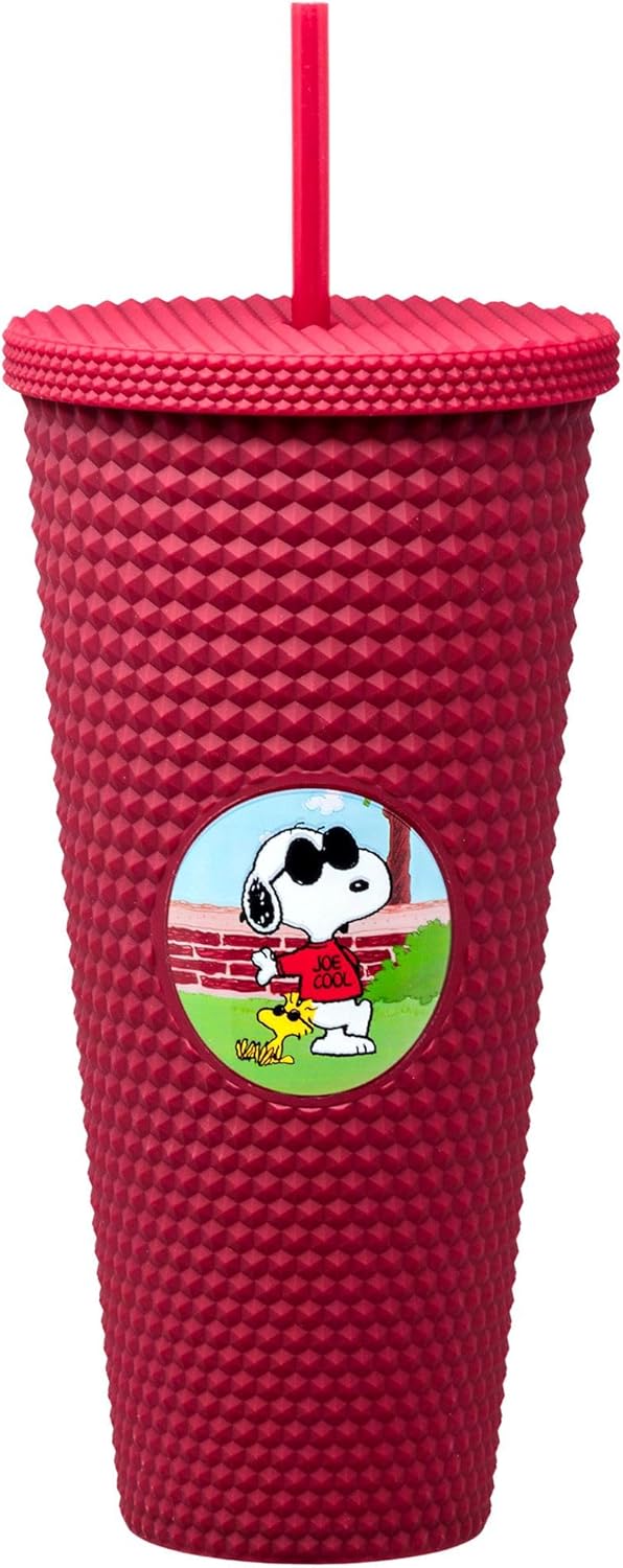 Featuring the image of Snoopy as Joe Cool and his sidekick Woodstock from the Peanuts comic strip and TV movies, this is a durable acrylic 32 ounce travel cup. It stands approximately 11.75″ tall and is not dishwasher or microwave-safe. Studded travel cups are perfect for hot or cold beverages. The cup fits in most vehicle cup holders and each mug features a travel lid and a straw ensuring no mess. It comes in a protective box and is a new, unused cup stored in a smoke and pet free environment.