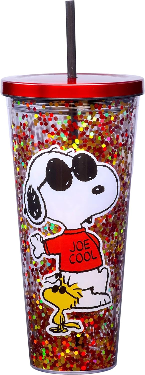 This is a 32 ounce clear acrylic glitter travel cup with a straw featuring the image of Snoopy as Joe Cool and his sidekick Woodstock from the Peanuts comic strip and TV movies. It comes in a protective box and is a new, unused cup stored in a smoke and pet free environment.