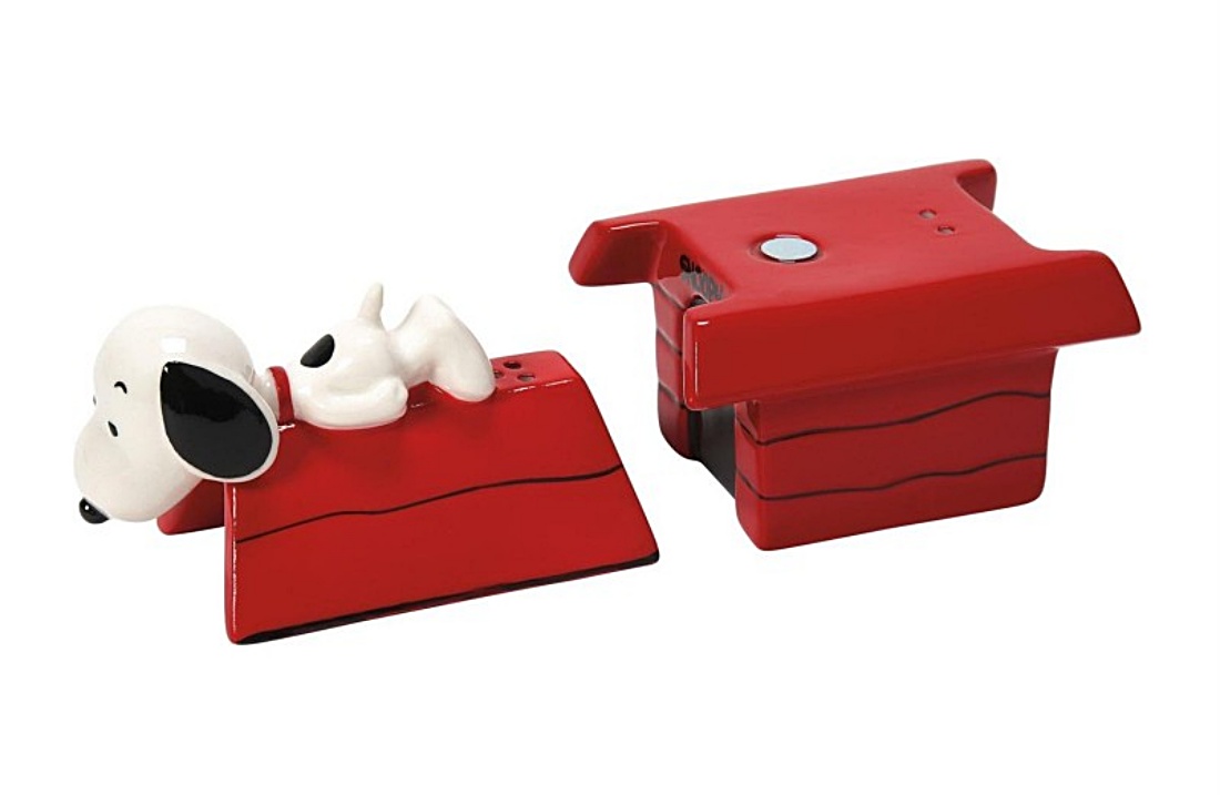 Perfect for any Snoopy fan, this sculpted salt and pepper set features the iconic pose of Snoopy resting on top of his red dog house. The two pieces are held together with a embedded magnets. Measuring 3.54 in H x 2.36 in W x 3.54, it ships in an illustrated box and is stored in a smoke and pet free environment.