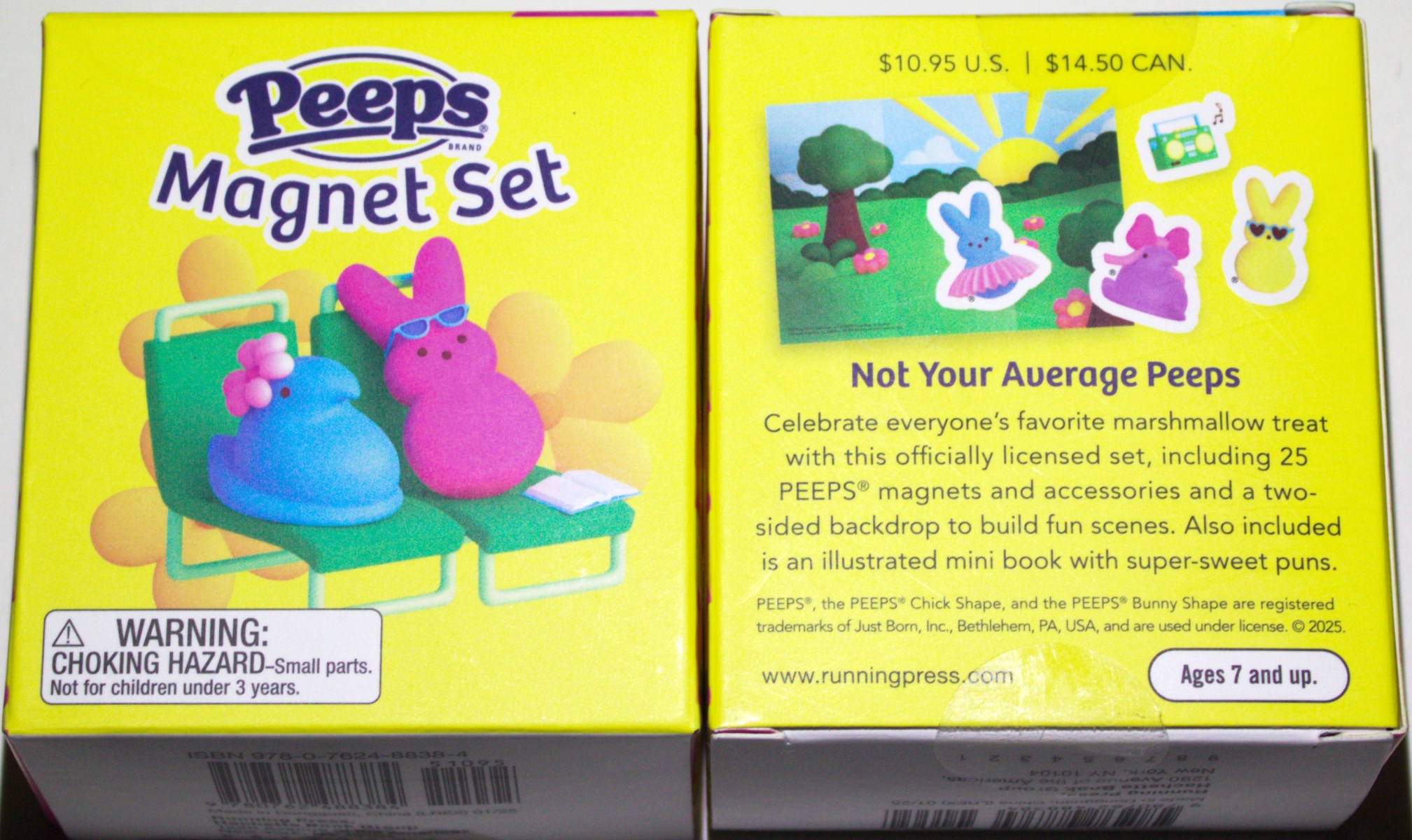 Bring a dose of springtime flair to any magnetic surface with this officially licensed set of super-cute PEEPS® magnets. This contains 25 full-color magnets featuring the iconic PEEPS® Chick and Bunny along with fun accessories, as well as a 2-sided illustrated backdrop to build springtime scenes. It also includes a 32-page illustrated mini book featuring fun PEEPS® puns. A must-have gift for fans of PEEPS® and the perfect stuffer for Easter baskets. Small size allows for fun anytime, anywhere, on any magnetic surface. This is a new, sealed copy that we purchased direct from the publisher and it has been stored in a smoke and pet free environment.