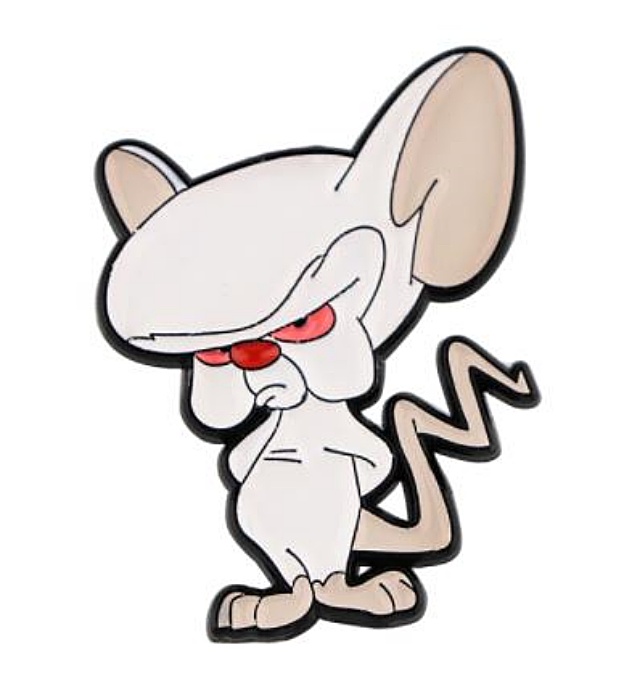 This is a die-cut metal enamel pin featuring the Brain pondering from the animated TV series Pinky and the Brain. This is a mint, unused metal enamel pin that measures 1.125″ wide and 1.375″ high and comes with a single clutch back pin for attachment. It is stored in a smoke and pet free environment.
