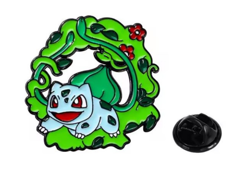 This is a 1.25″ wide x 1.25″ high metal enamel pin which features the image of Bulbasaur leaping thru grass from the anime game series Pok’emon. It is new and unused and stored in a smoke and pet free environment.