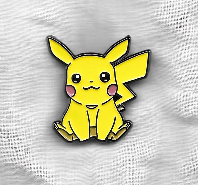 This is a 1.25″ high metal enamel pin which features the image of a smiling sitting Pikachu from the anime series Pok’emon. It is new and unused and stored in a smoke and pet free environment.