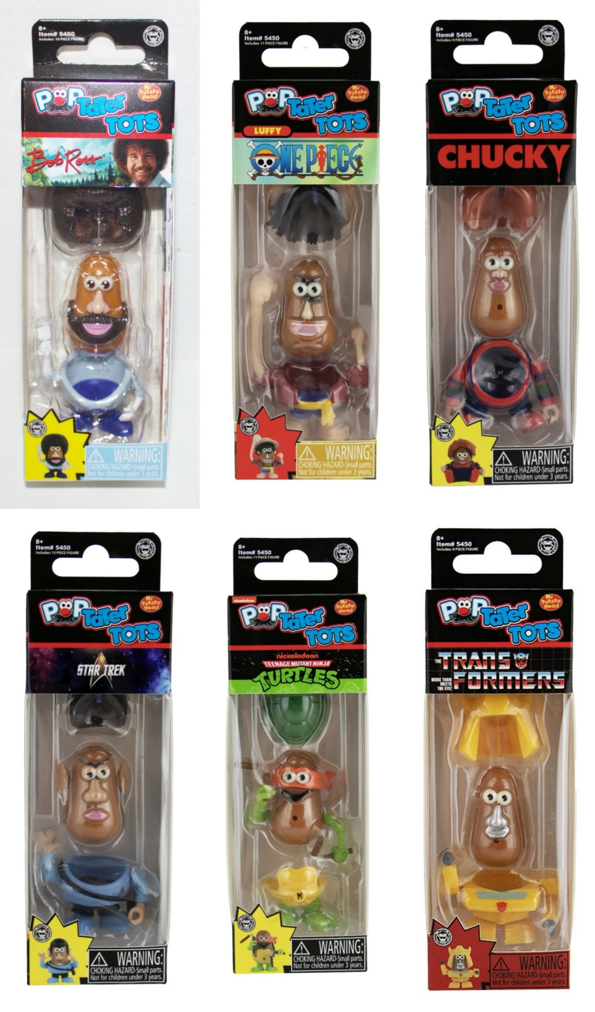 Produced by Super Impulse, this is part of their Poptaters line of toys and this series features the smaller version called Pop Tater Tots. There are six different in this first series measuring around 2″ tall when assembled, and are the ultimate fan mashup combining the iconic Potato Head with pop culture icons, creating hilarious, fun collectibles! Included in this series are: Bob Ross with 10 interchangable parts, Chucky from Child’s Play with 9 interchangable parts, Luffy from One Piece with 11 interchangable parts, Michelangelo from the Teenage Mutant Ninja Turtles with 11 interchangable parts, Spock from Star Trek with 13 interchangable parts and Bumblebee from The Transformers with 9 interchangable parts. We pulled these from a sealed case that we bought direct from Super Impulse and they have been stored in a smoke and pet free environment.