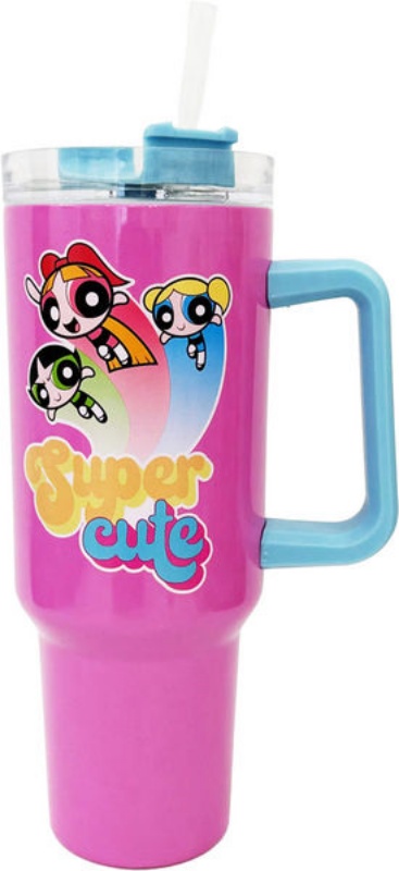 This is a pink stainless steel 40 ounce travel mug featuring an image of the Powerpuff Girls flying above the words “Super Cute” from the animated TV series. It has a blue handle and a straw and comes in a protective box and is a new, unused travel mug stored in a smoke and pet free environment.