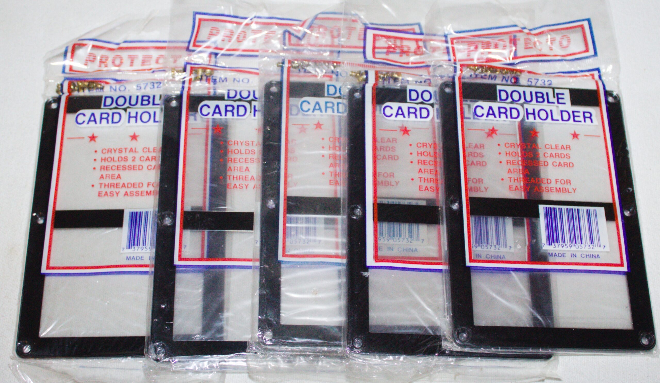 This is a lot of 5 new and sealed Protecto sports standard screw down double card holders. They measure 4.5″ x 6.5″ and will hold two standard modern trading cards. It has been been stored in a smoke and pet free environment since purchased new by us.