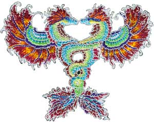 This is a new, unused 3″ high embroidered die-cut patch that depicts two rainbow dragons intertwined. It has a glue backing for easy application to any cloth surface and has been stored in a smoke and pet free environment.