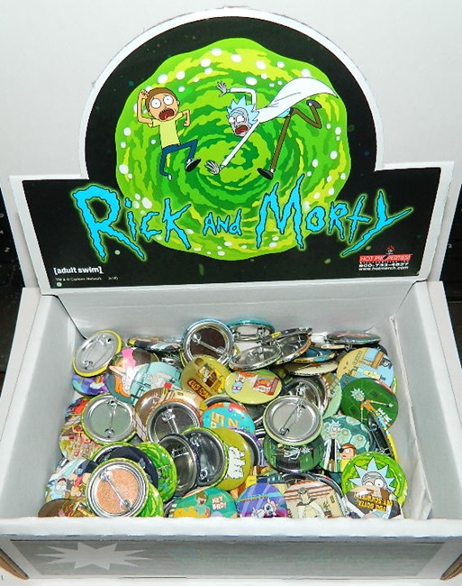 Produced in 2017, this is a licensed set of 100, 1.25″ wide metal buttons featuring multiple animation art images from the hit Adult Swim animated TV series Rick and Morty. This is a new, never used, assortment that comes in an illustrated display box and is stored in a smoke and pet free environment.