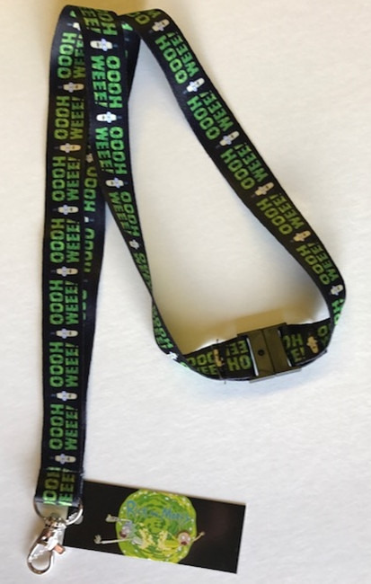 Produced in 2017 is this 18″ long metal, cloth, plastic lanyard that is covered with Mr. Poopybutthole and the phrase “OOOHH WEEE” from the hit animated TV series Rick and Morty. It can be used to hold keys, name tags, and more. This is a mint, unused lanyard stored in a smoke and pet free environment.