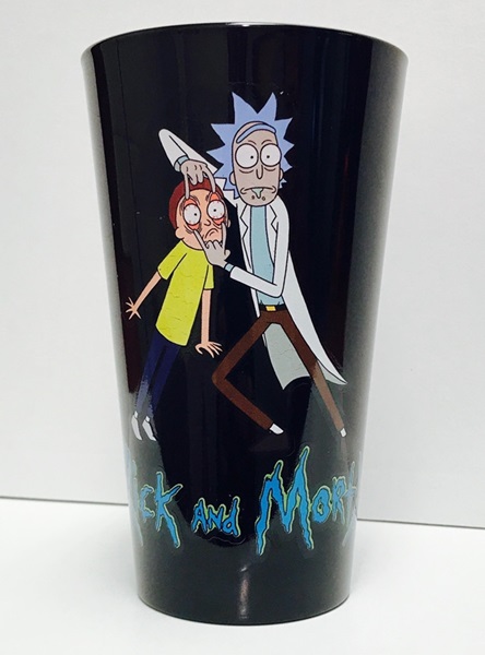 Produced in 2017 this is a 16 ounce black pint glass that features Rick Sanchez and Morty with Rick holding Morty’s eyes open from the popular animated show. This is a new, unused mug that is microwave and dishwasher safe and ships in an illustrated box.